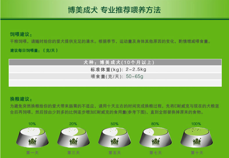 干糧飼喂,請隨時給您的愛犬提供充足的清水。根據季節(jié)、運動量及身體其他原因的變化,酌情增減喂食量。
